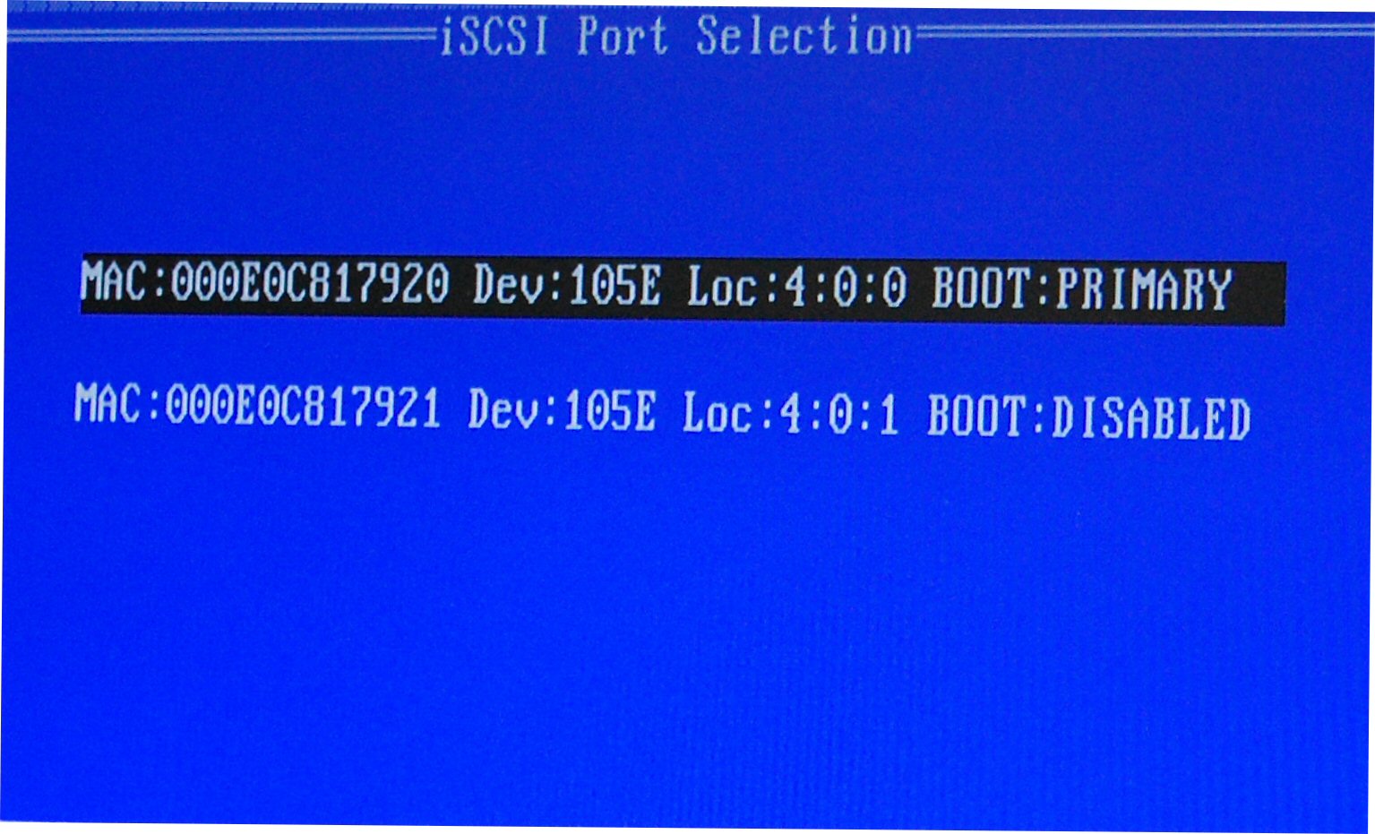 One network port in the system can be selected as the secondary boot port by pressing the 'S' key when highlighted. The secondary boot port will only be used to connect to the iSCSI target disk if the primary boot port fails to establish a connection. Only one port may be selected as a secondary boot port.