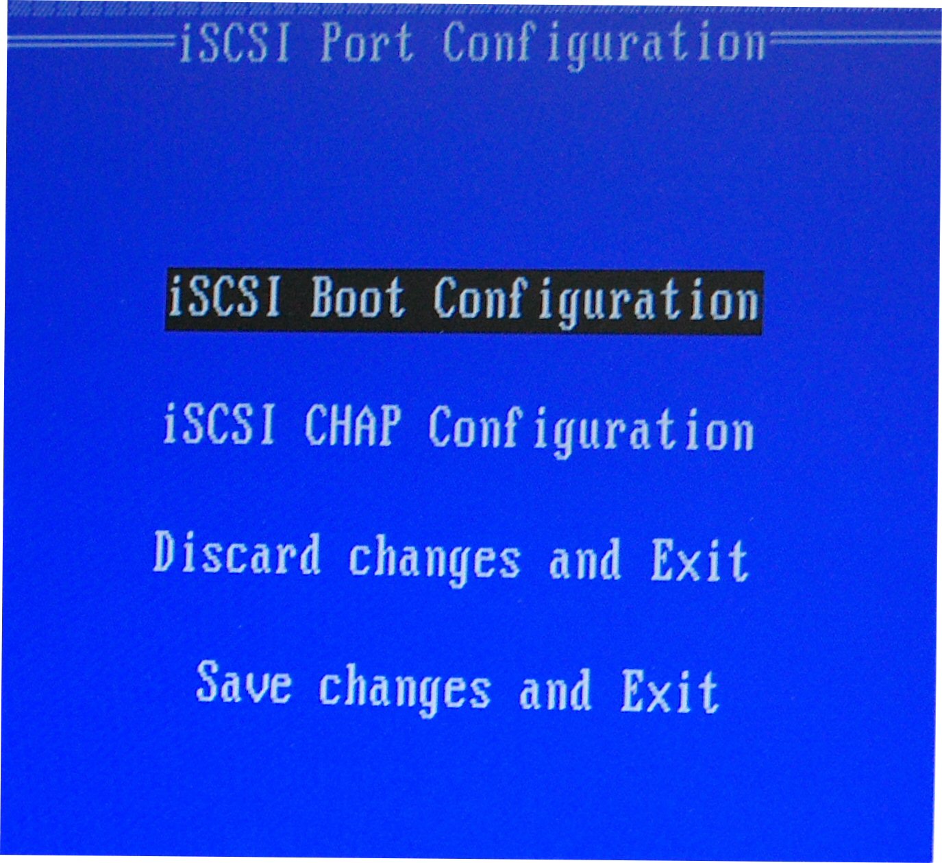 Discard Changes and Exit - Selecting this option will discard all changes made in the iSCSI Remote Boot Configuration and CHAP Configuration setup screens, and return back to the iSCSI Remote Boot Port Selection Menu.