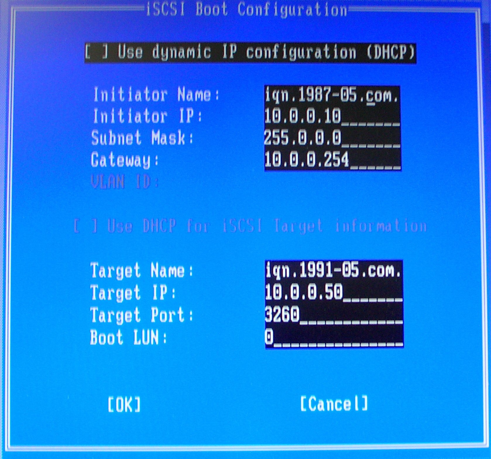 Use Dynamic IP Configuration (DHCP) - Selecting this checkbox will cause iSCSI Remote Boot to attempt to get the client IP address, subnet mask, and gateway IP address from a DHCP server. If this checkbox is enabled, these fields will not be visible.