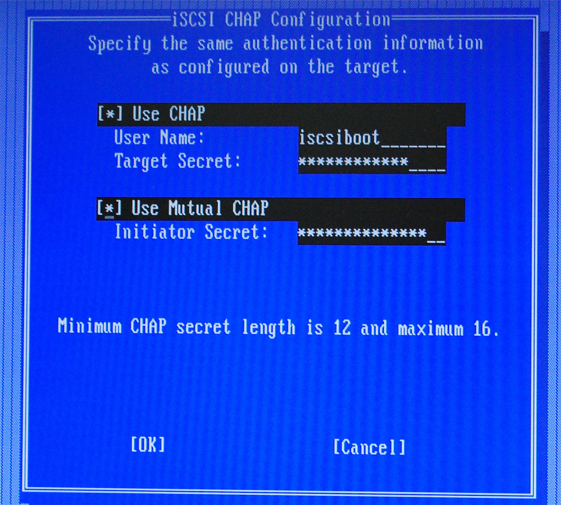 Target Secret - Enter the CHAP password in this field. This must be the same as the CHAP password configured on the iSCSI target and must be between 12 and 16 characters in length. This password can not be the same as the Initiator Secret.