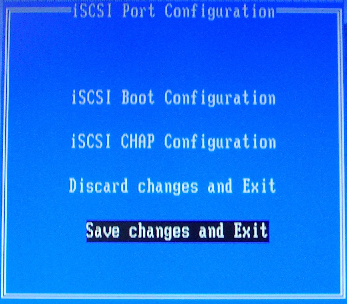Save Changes and Exit - Selecting this option will save all changes made in the iSCSI Remote Boot Configuration and CHAP Configuration setup screens. After selecting this option, you will return to the iSCSI Remote Boot Port Selection Menu.